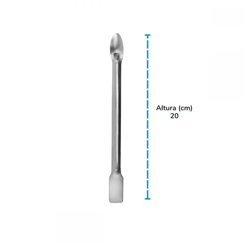 - Uma extremidade com colher, medindo 30 x 16mm e outra, plana, com acabamento reto, medindo 35 x 17mm;